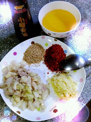 搅拌好的辣椒油倒入装有葱酥的碗里