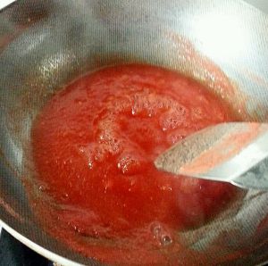 不要停手,一个劲的搅拌,放一点点盐熬制粘稠状快出锅前挤几滴柠檬汁,再熬制1.2分钟。