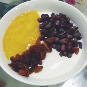 放凉后的双皮奶可以加入你喜爱的配料,我喜欢吃红豆和葡萄干,顺带还淋了一些芒果泥