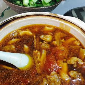 锅里放油 在放葱姜蒜八角煸香……加牛腩炒香。倒入适量料酒、生抽、蚝油、水(没过肉)加入番茄。小火焖最少50分钟。