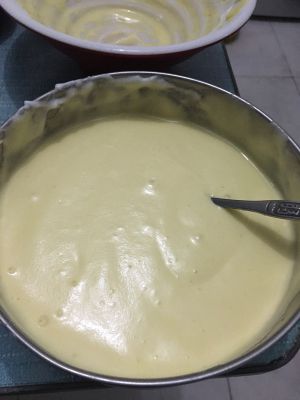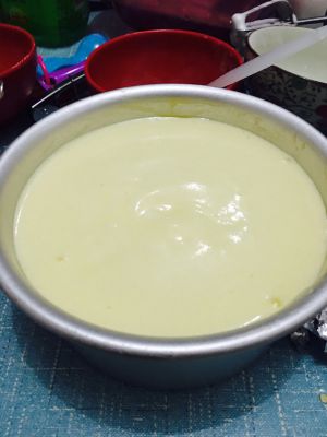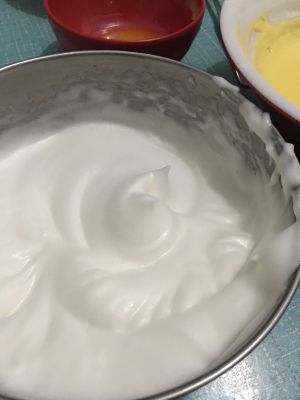 烤箱,180度预热。上下层。蛋白加入蛋黄糊中,搅打均匀!切记不要画圈!会消泡,倒是蛋糕塌腰等等。