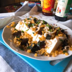 用刀把豆腐划成一片片,依次撒上皮蛋粒,榨菜碎,虾皮,葱花,淋上酱油,麻油,辣油
