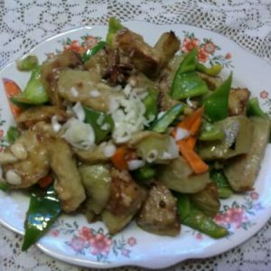 放入炸好的茄子和炒好的青椒继续翻炒。