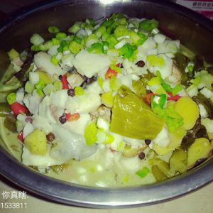 锅里放油,加入花椒生姜爆香,然后加入酸菜,把酸菜炒熟后倒入刚才的鱼汤,锅中煮沸后倒入腌制好的鱼片,大火煮五分钟,期间加入盐,料酒,辣椒,白糖,醋,等调料。