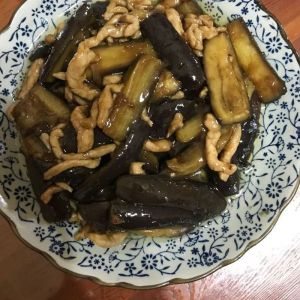 把肉丝捞出,多的油留在锅中,把茄子放入锅中加入先准备好的调料翻炒后再放入肉丝。