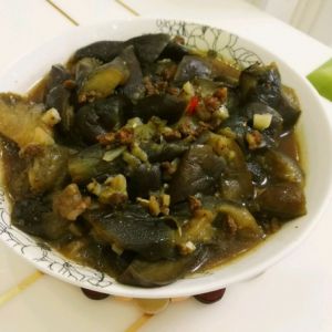 待肉沫成一粒一粒并且有肉香味的时候,倒入浸过油的茄子,翻炒约半分钟。