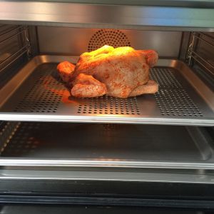 烘烤10分钟之后暂停,取出在表面刷脆皮水,继续入蒸烤箱烘烤至结束,自动保温一会取出