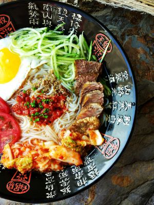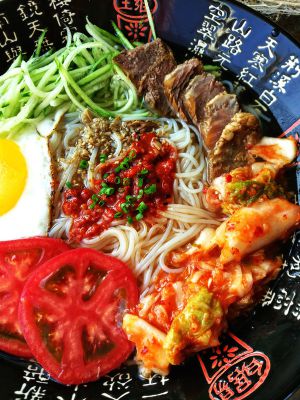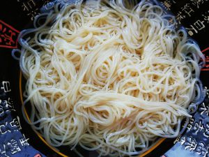 捞出,过两三次冰水后,沥净水份,倒入大碗中。用冰水冲洗,冷面才会劲道弹滑