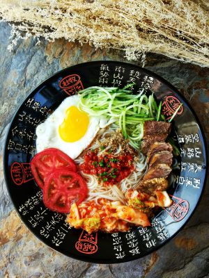 摆煎蛋或水煮蛋切片,黄瓜擦丝,西红柿切片,切酱牛肉和辣白菜