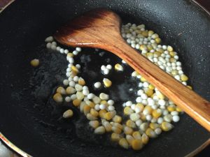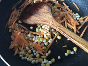 放入芡实翻炒,然后放入玉米汁一起翻炒
