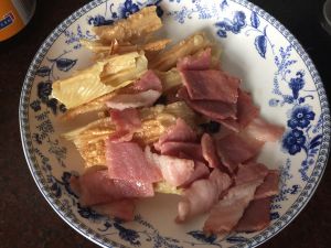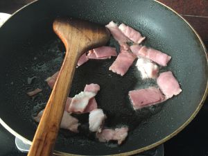 腐竹装盘备用,利用剩下的余油炒香培根