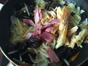 放入培根和腐竹,加入适量开水炒