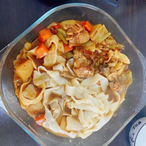 昨天剩的大盘鸡,微波炉热一下,这里我说一下,里面有点颜色深的面条是昨天晚上没吃完的,早晨吃我不会很软。