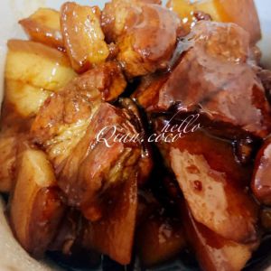 倒入开水煮,大火煮开后转小火焖。(这时我用的是宝宝电煲粥锅炖的,时间比较久,带孩子出去遛遛,在外面玩了一个半小时,回来再把电煲锅的肉倒出来用锅收汁。)