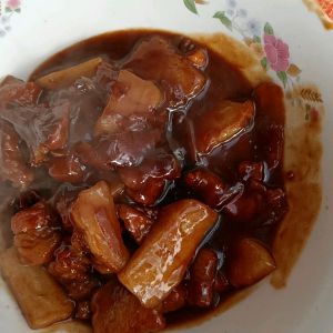 然后起锅放油,放五块冰糖,放葱姜蒜,放肉,炒起来,在放生抽老抽耗油,盐,料酒,炒起来,在放水,煮一会,收汁,好了啊