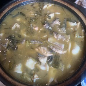 将鱼片用手一点点放到汤多的位置。转小火。煮3分钟。起锅放点猪油。盛出。