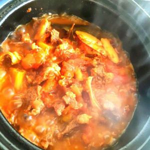 加入开水,放入去皮西红柿,加几勺盐,慢炖一小时。
