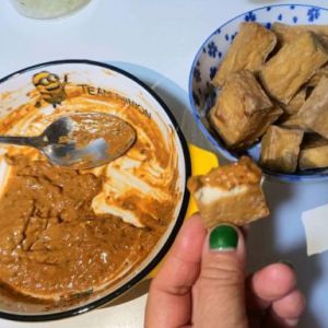 把豆腐切适等块,放进空气炸锅炸制两面金黄,备用
