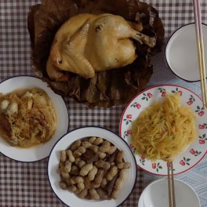 腌好的鸡用荷叶包好,用棉绳绑好。