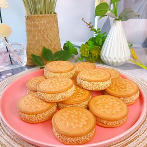 南瓜表面刷一层清水夹在两块饼干中间(沾了水芝麻能更好的粘住)