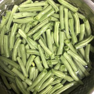 4、加入蒜瓣,加入扁豆,顺着锅边淋入黄酒、生抽,烹出香味。