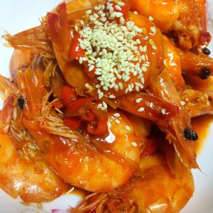 糖色炒好后迅速放入大虾,煸炒过程中用勺子背部按压虾头,使虾黄充分溢出,每一个虾头都要按一按(这是一个关键步骤),放入配料葱姜丝。翻炒一下,顺着锅边倒入料酒。继续翻炒。放少许十三香加入少许开水刚刚没过大虾即可,然后盖锅盖。静等五分钟后改大火收汁,当汤汁收到快没时倒入一点醋快速翻炒盖锅盖,(目的是使虾皮钙化虾肉与虾皮分离,剥虾皮时才不费力)30秒后打开锅盖放入食盐和番茄酱快速翻炒出锅,装盘可撒一点白芝麻美化(我喜欢吃有点儿辣的配料中放入了小米辣也非常好吃)