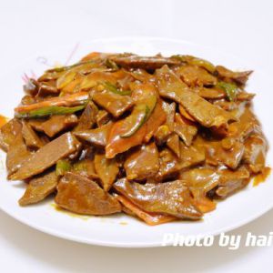 锅中放入少许油,放入葱姜蒜爆香后放入猪肝和配菜翻炒一分钟。