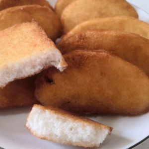 锅中倒油烧至六成热,准备一碗清水,拿着馒头片迅速的按到清水里沾下水,稍微控下水,下到油锅里开炸(因为有水,需要当心溅出的油点不要烫到手)