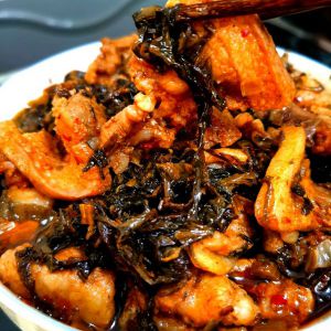 洋葱,大葱生姜切丁炒到微微发黄就行,过了会有点苦涩,倒入梅干菜