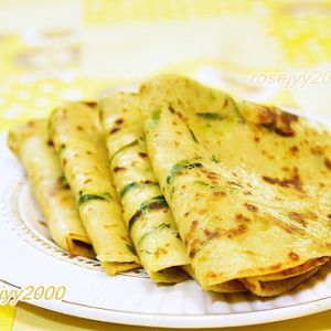 待饼的底部凝固微焦,把饼翻转,也煎至微焦,盛起,再煎另一块,直到把面糊煎完;