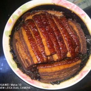 锅中烧油,油七分热,把用老抽涂过的五花肉,肉皮朝下放入锅中炸制并迅速盖上锅盖防止油飞溅烫伤,待锅中没啥动静,然后把肉其他几面稍微炸制,捞出迅速放入凉水中过凉。