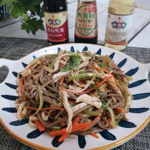 在盘子里依次码放面条,胡萝卜丝,黄瓜丝,鸡丝,香菜末,花生碎,淋上调味汁。