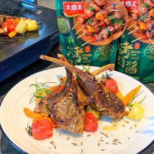 每面烤约30秒,至羊肉变白,同时将配菜放在烤盘边缘进行烤制。