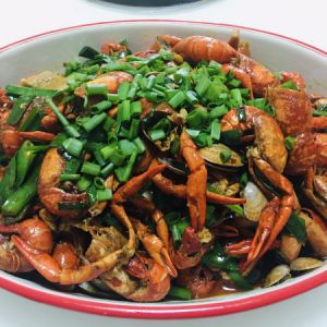 倒入炸好的小龙虾,放入葱结,中小火焖煮,计时15分钟