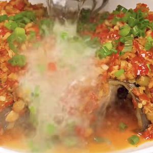 蒸好的鱼头倒出多余的汤汁,用勺子均匀的铺上炒好的剁椒,再上锅蒸五分钟、蒸好后撒上葱花,再泼上热油激发出的香味即可。