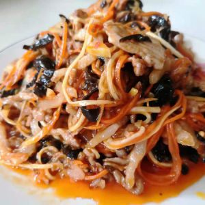 黑木耳、胡萝卜、茭瓜、姜切细丝,大蒜、泡椒剁成末。