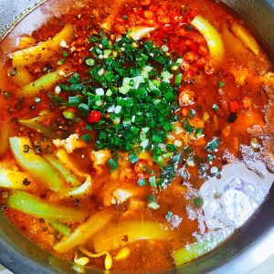 锅中倒入菜籽油烧热,放入大葱和火锅底料炒香