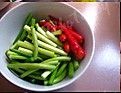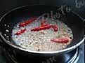 锅里放少许油,下蒜苔和红辣椒炒制片刻,当中可加入少许水同炒。