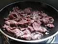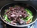 锅中座油,下腌好的牛肉煸炒,牛肉一变色即刻出锅装盘备用。