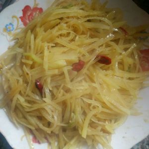 3.把沥干水的土豆丝倒入锅内翻炒(ps:切好的土豆丝要多过几遍水,免得炒的时候淀粉多影响口感)然后加生抽,加醋(加完生抽紧接着一定要醋,如果等菜熟了再加醋,土豆丝就面了不好吃了),等菜熟了加盐和鸡精翻炒均匀,出锅,大功告成!