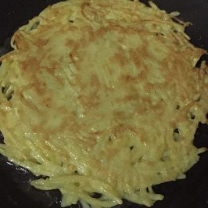 油烧热,把拌好的土豆丝夹点到锅里铺成薄饼,小火煎至金黄色。