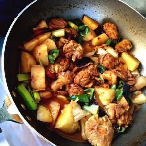 倒入水没过鸡块,倒入土豆。往里面倒入啤酒少许。啤酒很关键,提味好。盖上锅盖小火炖20-30分钟。