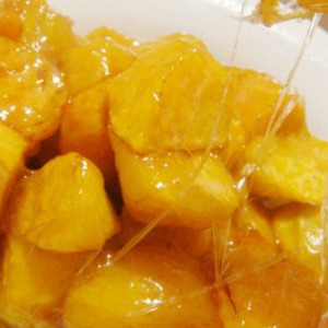 将挂上糖的地瓜倒入抹过油的盘内,上桌的时候要上碗白水,沾着吃,才不沾牙