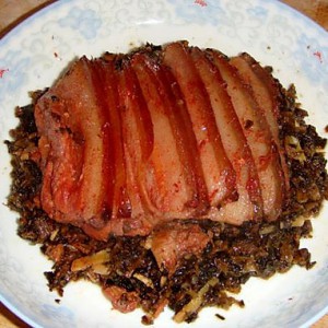 煎过肉的锅里放蒜末姜末炒香,加入梅干菜翻炒,加少量水、盐、鸡精,大火收汁,五花肉切薄片,每片刷红腐乳汁,皮朝下码在小碗里;