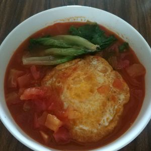 铺上生菜,加上鸡蛋,倒入熬好的番茄汤,美味又营养的番茄鸡蛋面就可以了。