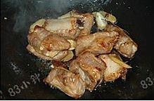 下入排骨,炒至排骨两面金黄,下姜蒜葱,八角桂皮炒香。加盐,料酒,生抽适量。