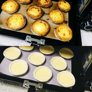 4、将蛋挞液过筛后倒入蛋挞皮,每个8~9分满即可。