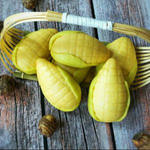 把黄色面团揉圆,搓成一头圆一头尖,用刀切上横竖纹如图,把两片叶子分别贴在两边,做成玉米的样子。依次做好