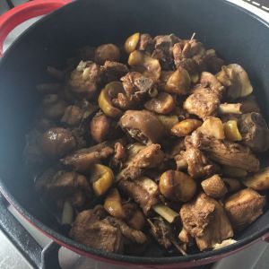 跑山鸡剁成小块,也别太小,不然没多久肉就煮烂了但是板栗还没耙就不好了。之前忘记多拍几张照片了,鸡肉我事先没有码盐怕咸,倒油直接下锅炒到鸡皮鸡焦边后,加老抽,蚝油,生抽,姜片,蒜,继续炒到鸡肉全部变白后,加水继续煮半小时。