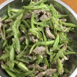 锅内无水,烧热倒油,待油烧至六成熟后加入肉丝滑炒变色盛出备用。锅内留底油加入四季豆丝翻炒,炒熟后加入肉丝,适量的盐和蚝油翻炒均匀即可关火,盛出装盘。